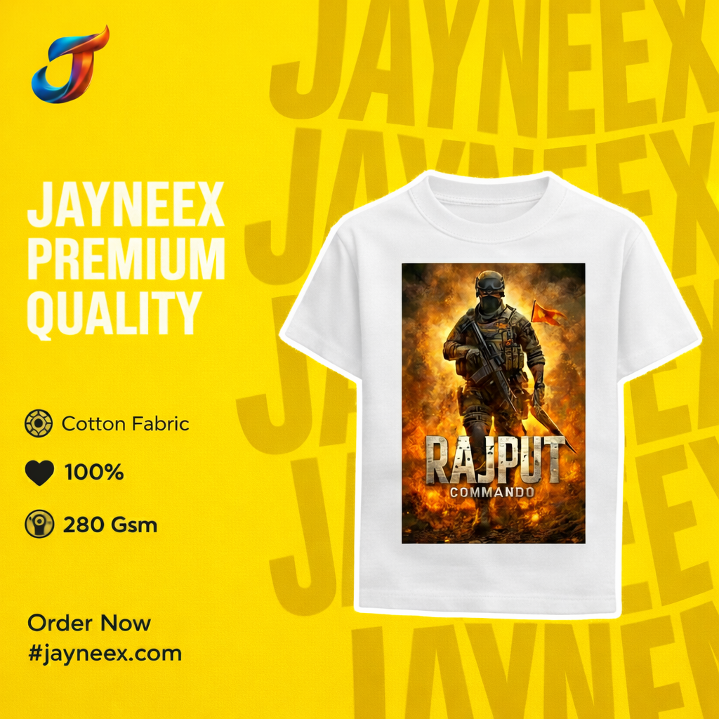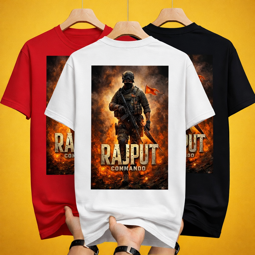 This premium oversized white T-shirt features a large rectangular back print placed centrally for maximum visual impact. The artwork showcases a tactical commando standing strong in full combat gear, surrounded by intense fire and smoke effects that symbolize power, resilience, and unstoppable energy. The bold “RAJPUT COMMANDO” typography at the bottom enhances the commanding presence of the design.