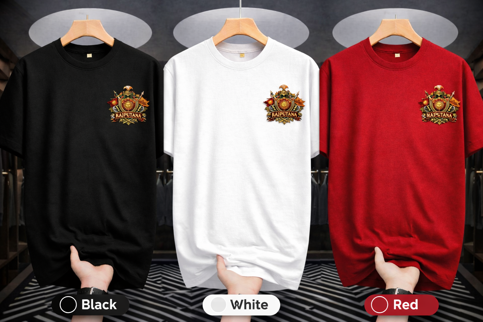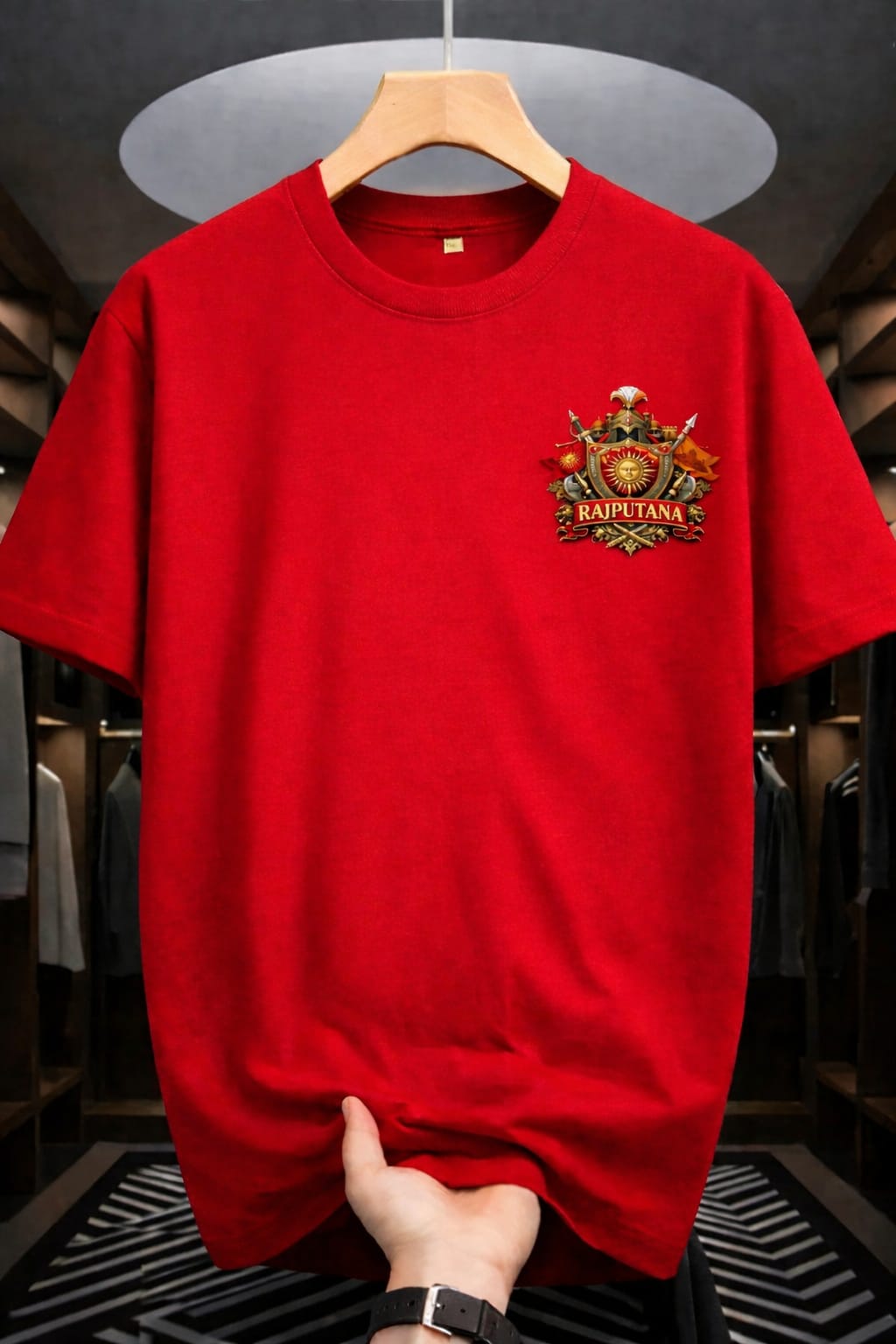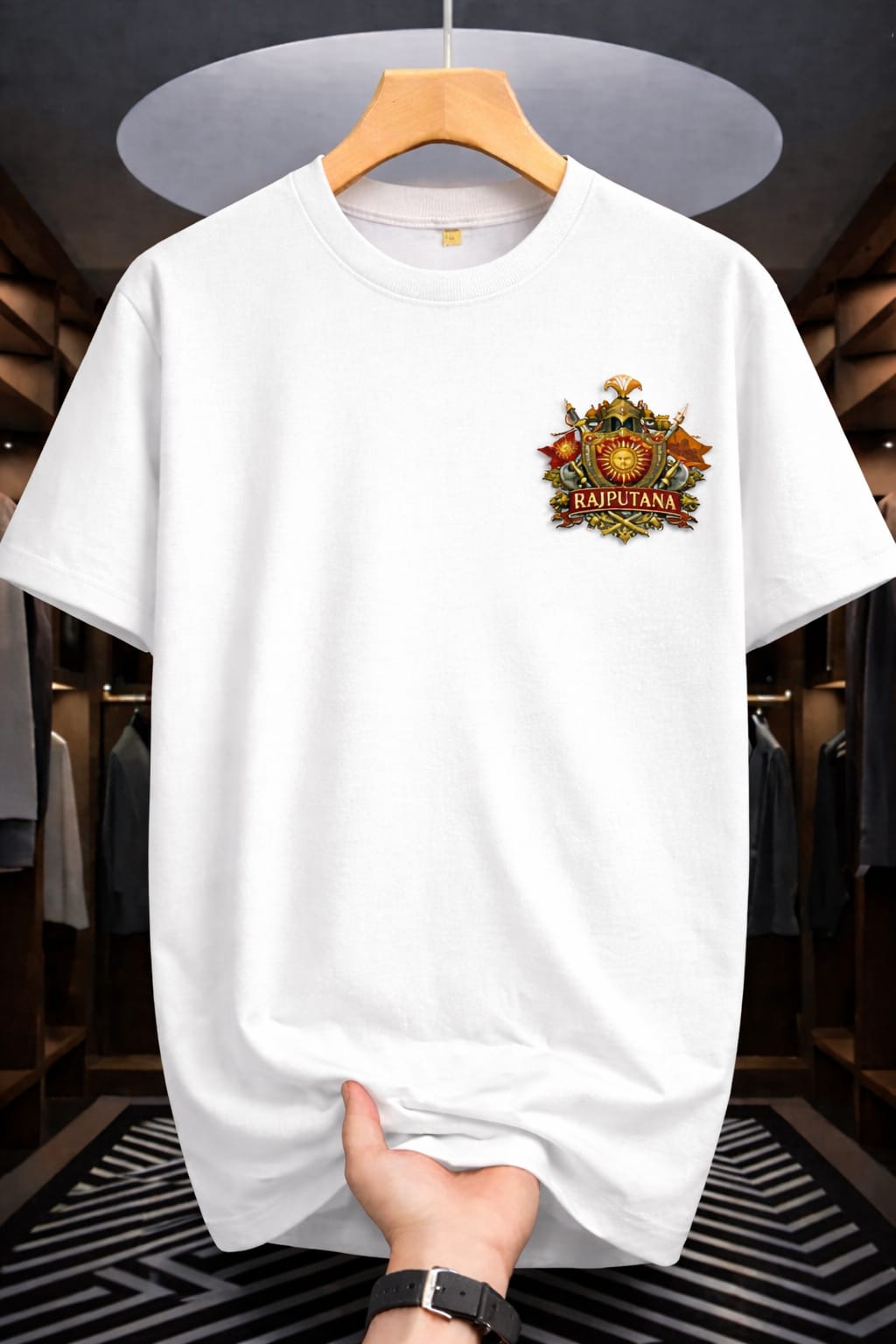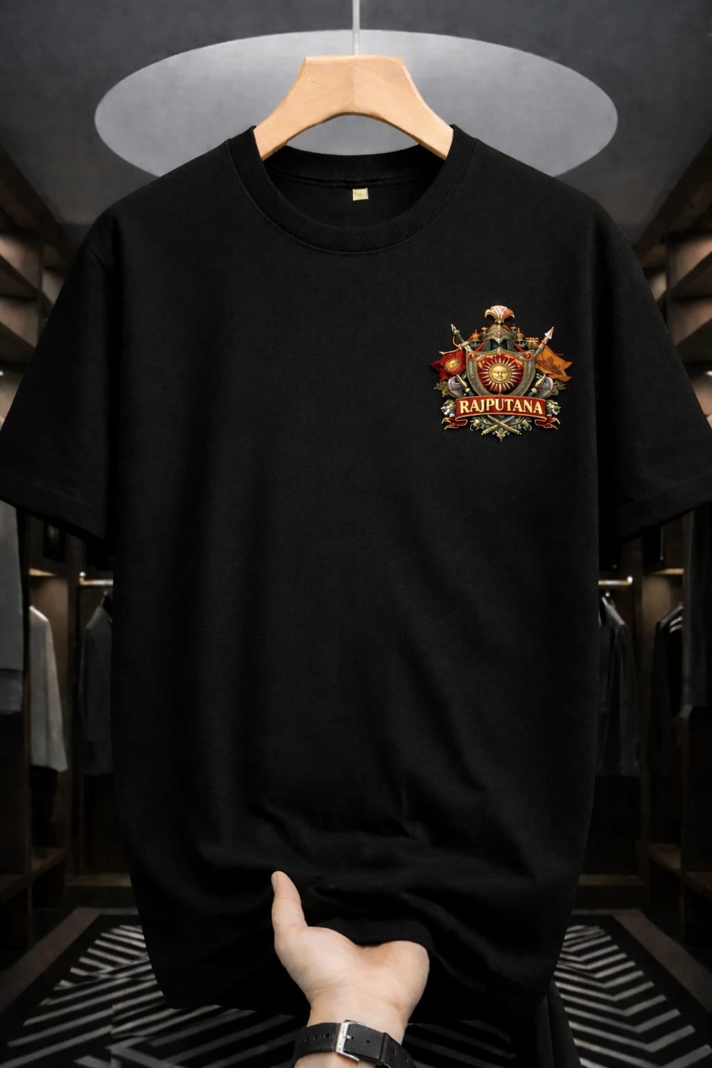 On the front, a refined Maharana Pratap emblem is placed to maintain a clean yet powerful aesthetic. This emblem enhances the heritage appeal while keeping the overall look balanced and wearable.