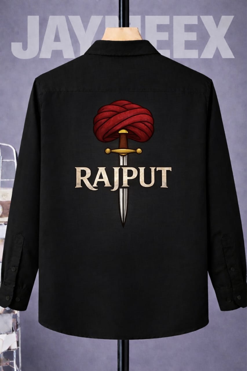 The Thakur Paggdi Crest Shirt represents authority, legacy, and fearless identity. The back features bold “Thakur” typography highlighted with a knife graphic and a traditional red paggdi element — symbolizing pride, honor, and warrior roots.