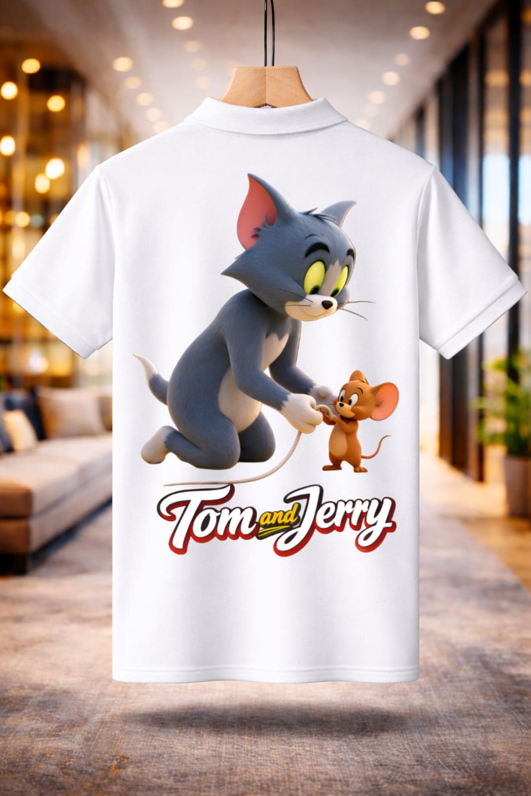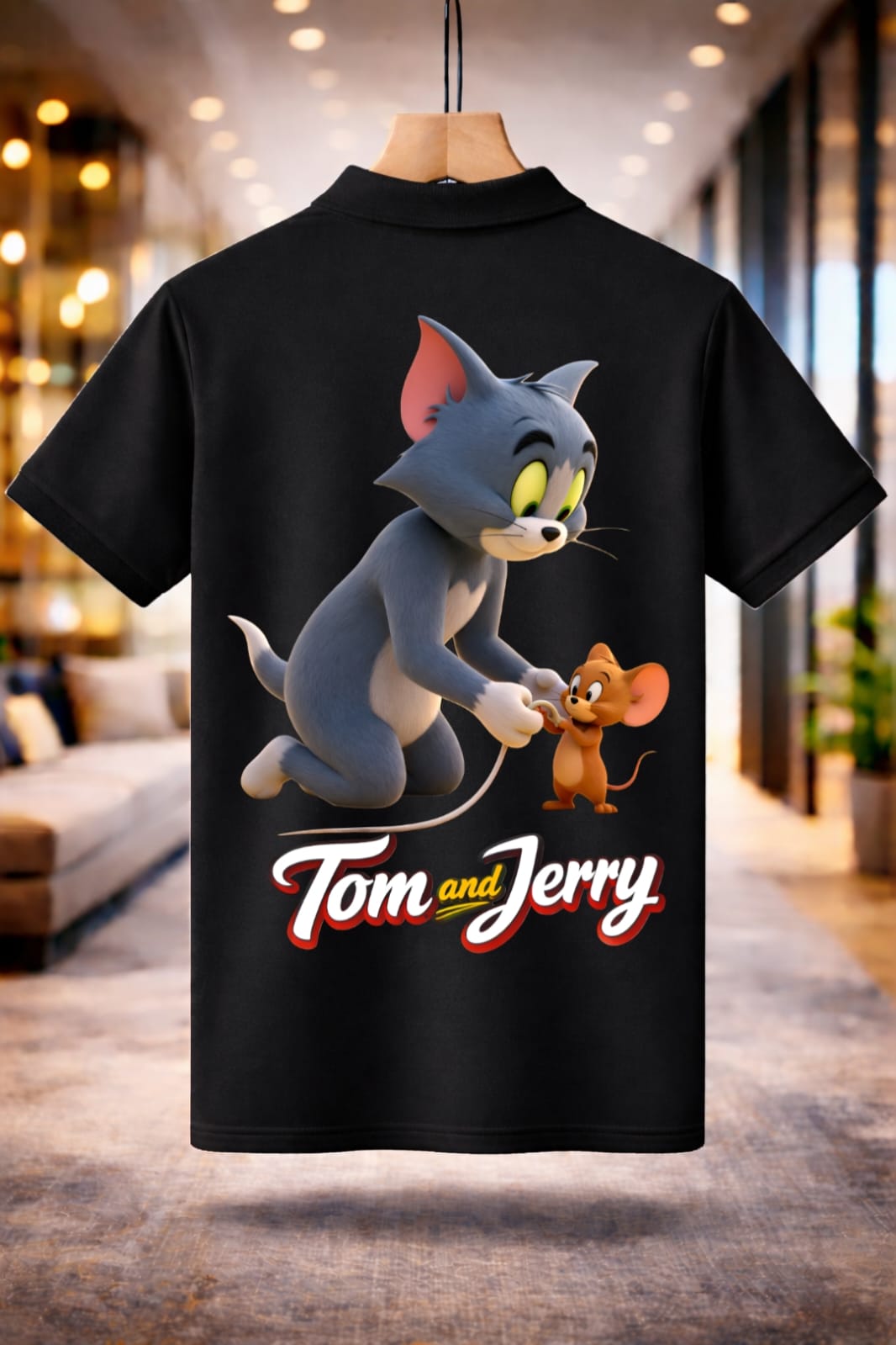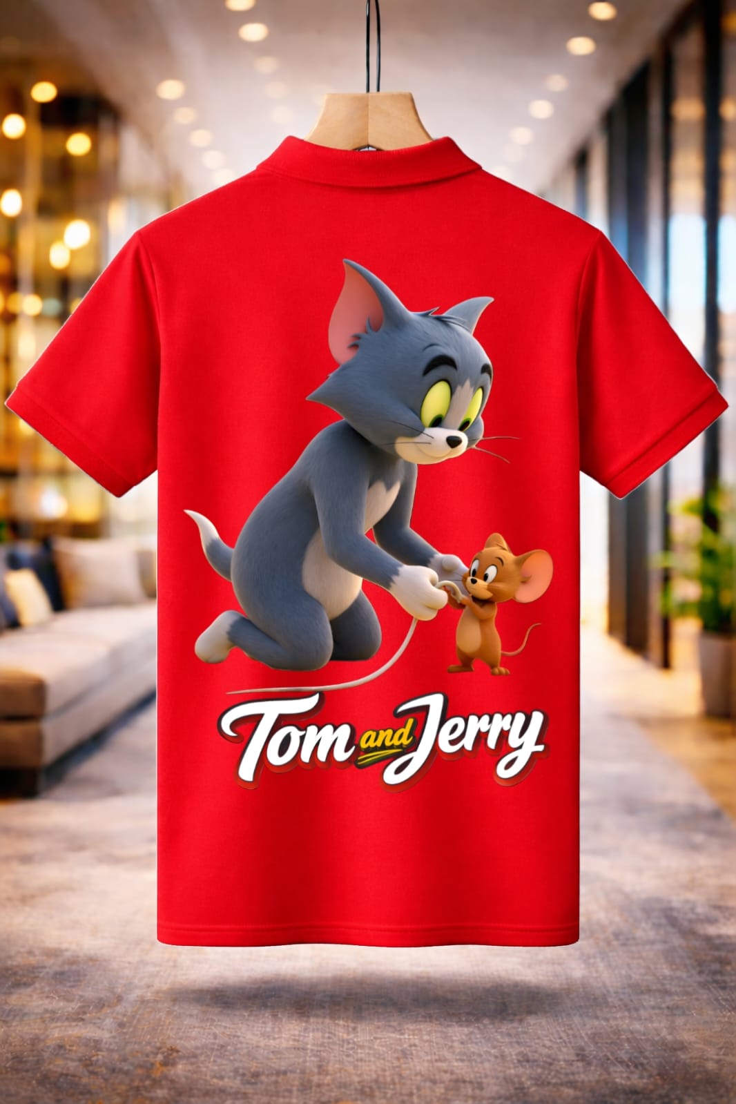 The Jayneex Tom & Jerry Collar T-Shirt features a stylish polo collar with a bold cartoon graphic in black, white, and red. Comfortable, trendy, and perfect for casual everyday wear.