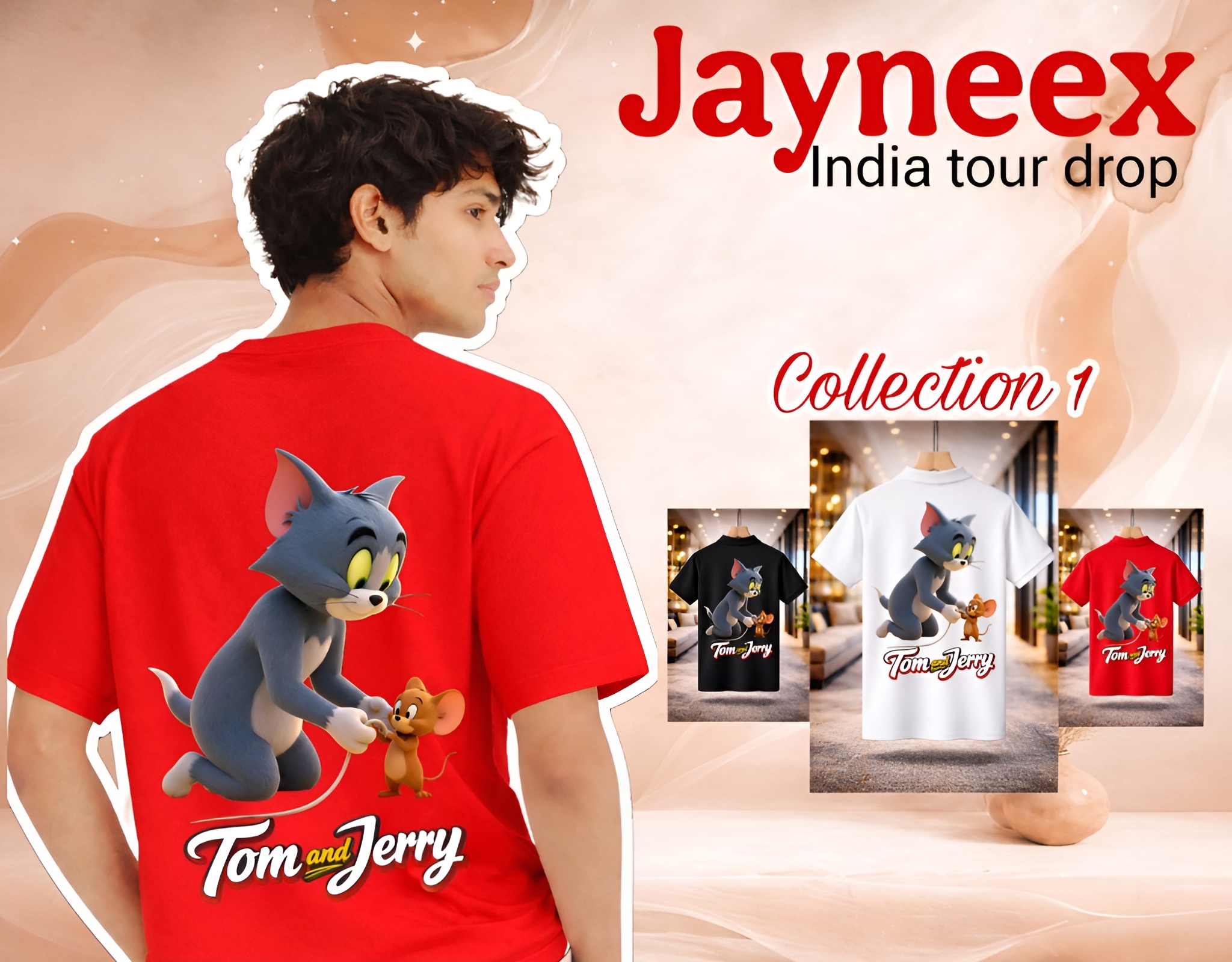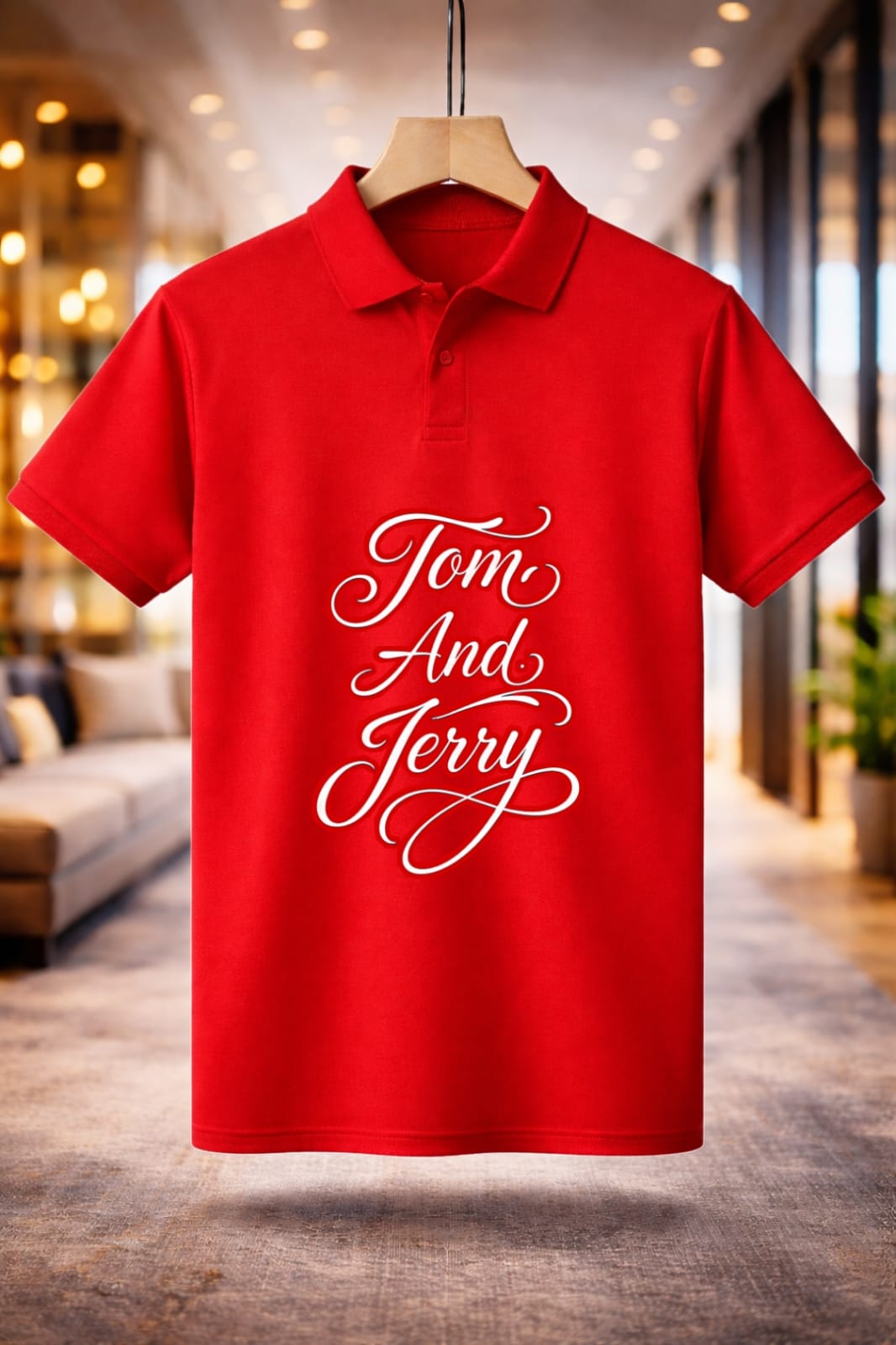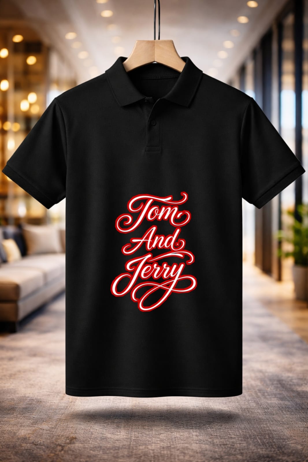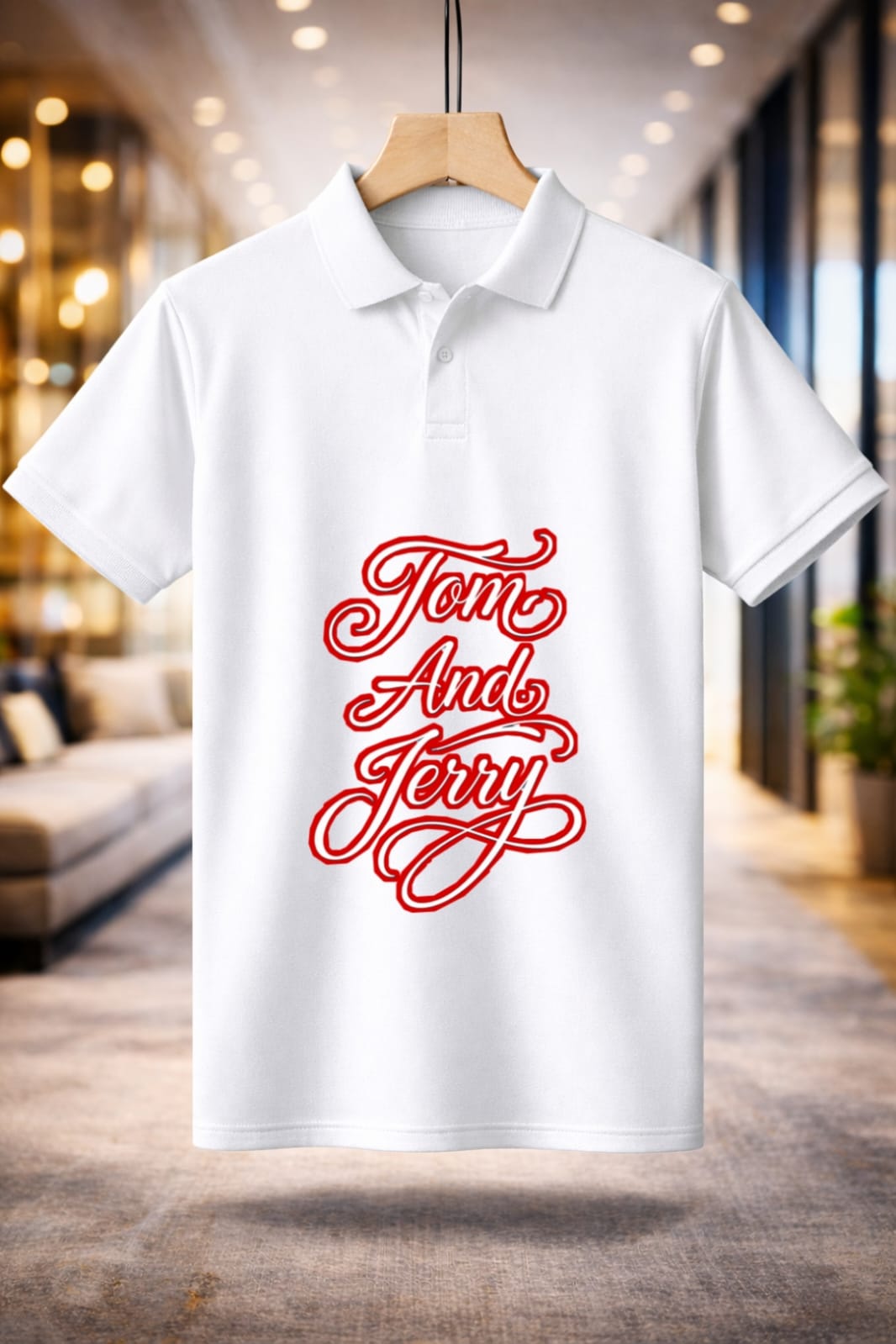 The Jayneex Tom & Jerry Collar T-Shirt features a stylish polo collar with a bold cartoon graphic in black, white, and red. Comfortable, trendy, and perfect for casual everyday wear.